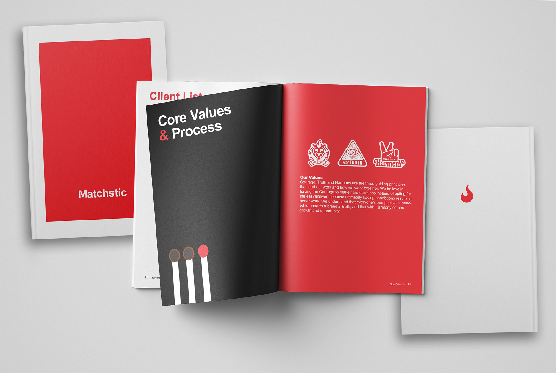 Premium Book for Matchstic, an Atlanta Based Graphic Design Company. A SCAD Business of Graphic Design project. The book is meant to reflect the brands minimalist brand identity. Showcasing their best work and core values.